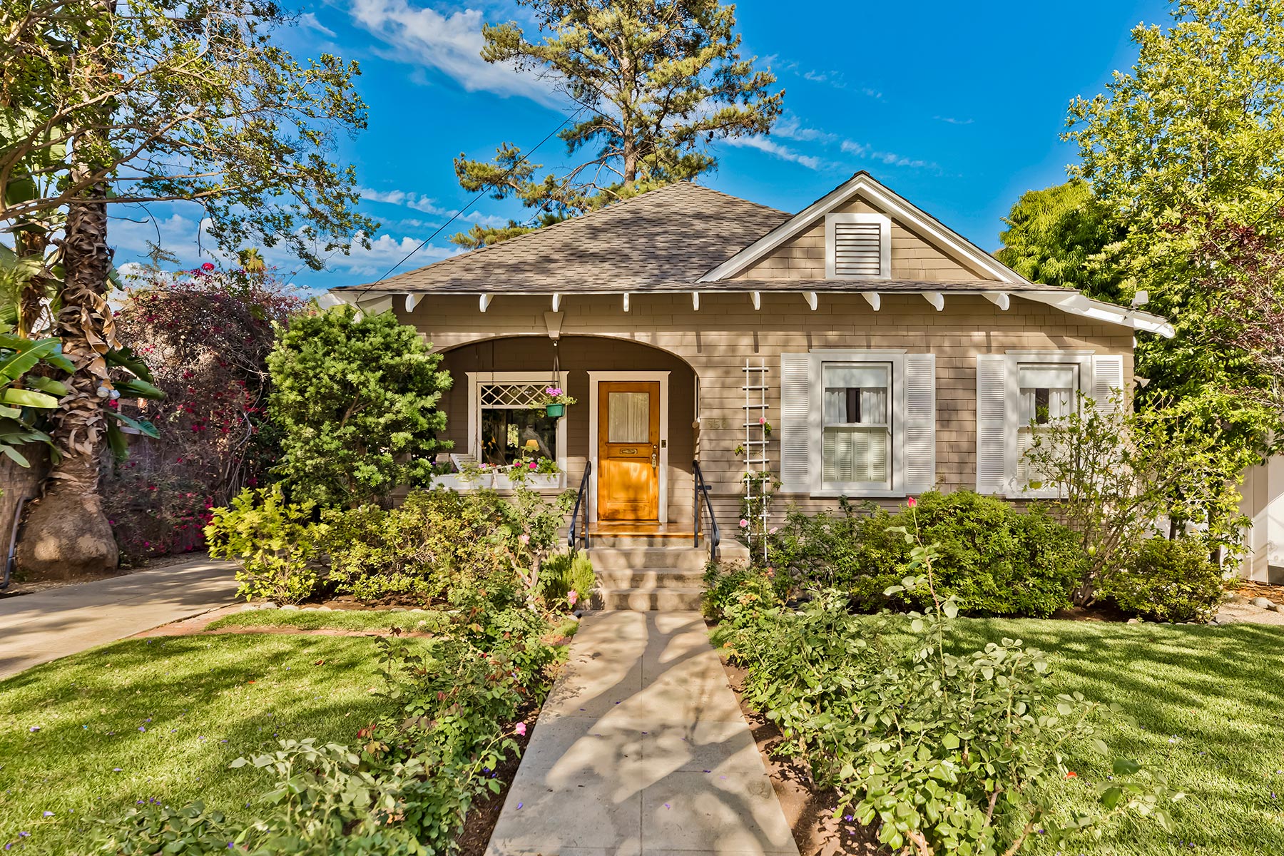Just outside, there is a lovely covered back porch. Designed with attention to detail, this is one of the many great features of this property. The main bedroom has two closets, built-in bookshelves, and wood floors. There is a shared full bath and a second bedroom. The guest house, built in 1943, consists of a great room with a stone gas fireplace, beamed ceiling, skylight, and a large picture bay window. The floors are tile throughout. The kitchen has tile counters, a breakfast bar and is open to the great room. The bedroom has excellent closet space, and there is an attached 3/4 tiled bath. The guest house also has a private covered brick patio and gardens surrounding it. The mature landscaping offers many trees, flowering vines, camellias, and roses. This is the perfect neighborhood for those who enjoy walking, only two blocks from the South Lake Avenue Shopping district and just a few more to Cal Tech.