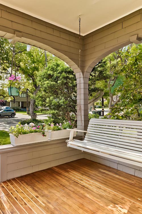 Located in the Madison Heights neighborhood on a tree-lined street, an enchanting 1906 wood-shingled cottage with an equally charming guest house has been loved, cared for, and improved over the years. At first approach, rose bushes line the walkway to a welcoming front porch with a bench swing harkening back to another era and a slower pace. A handsome carved wood with beveled glass front door is 1906 original, as are the hardwood floors. The living room and dining room have high ceilings, multiple windows, and the dining room has a bayed window with a built-in window seat and storage. Built-in bookshelves line the walls of the dining room, and there is a built-in buffet. The kitchen has been updated, the counters are soapstone, and there is ample cabinet storage. The kitchen is open to a den, with a powder room and laundry closet: beadboard paneling, wood floors, and multiple windows with garden vistas and light.